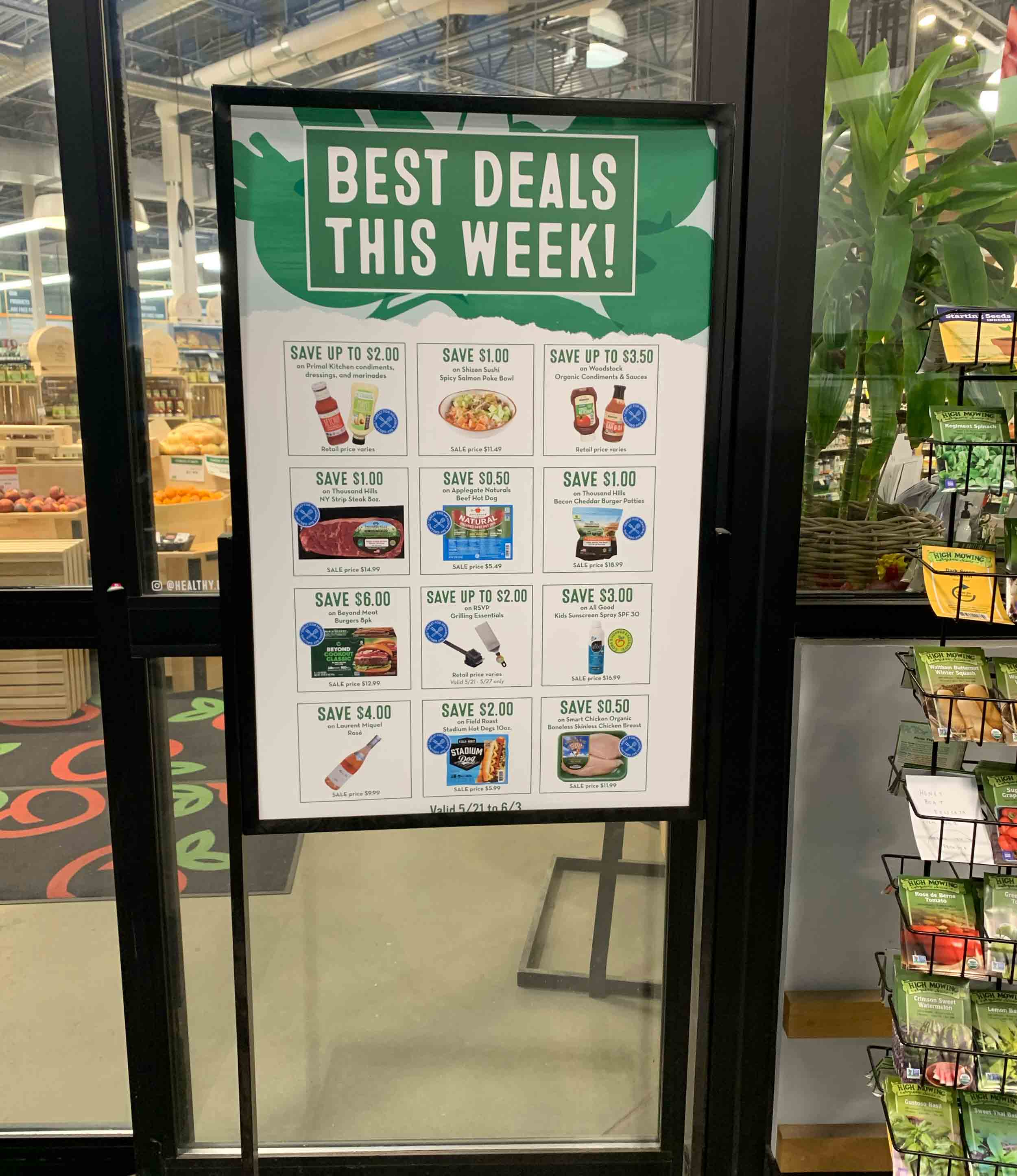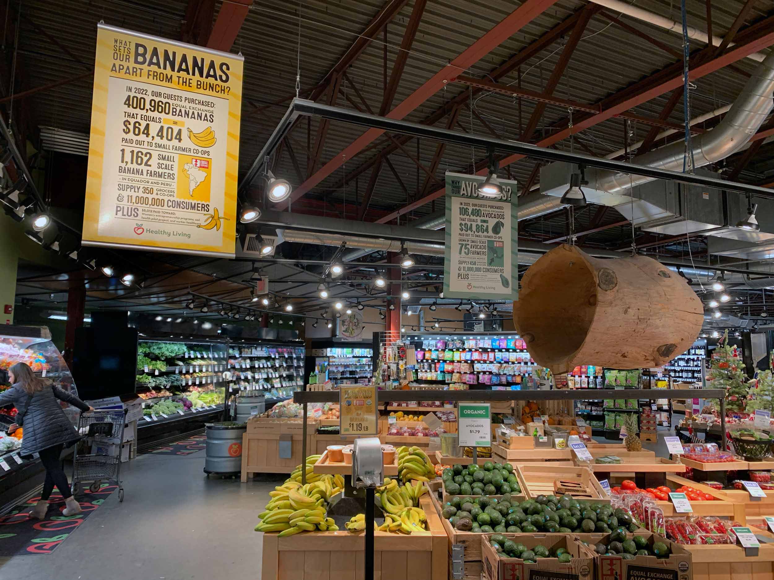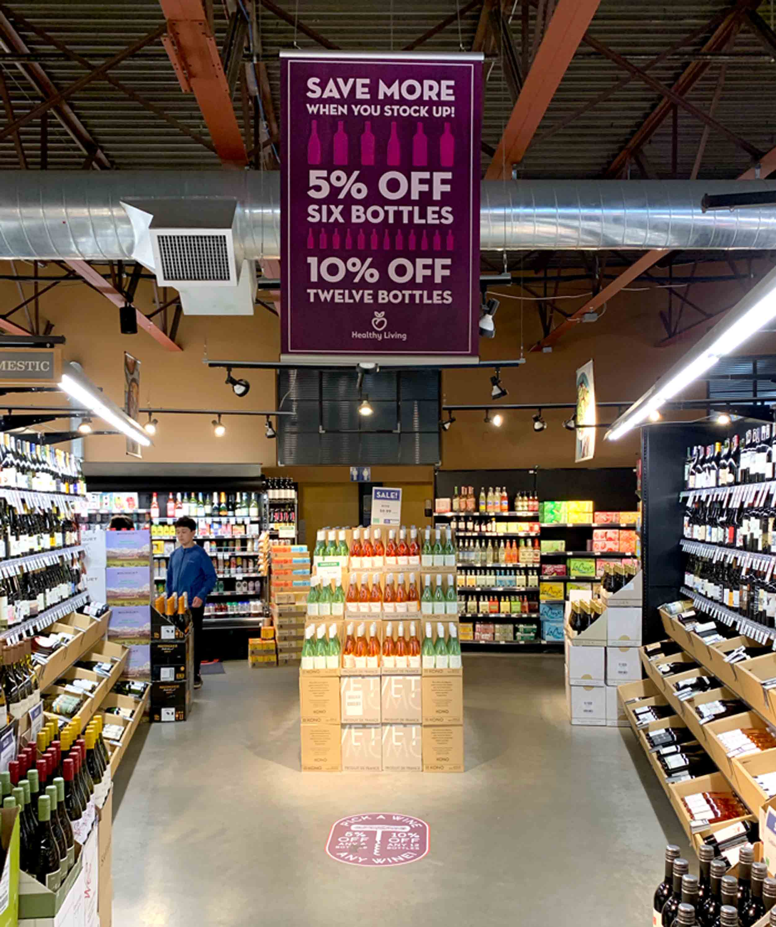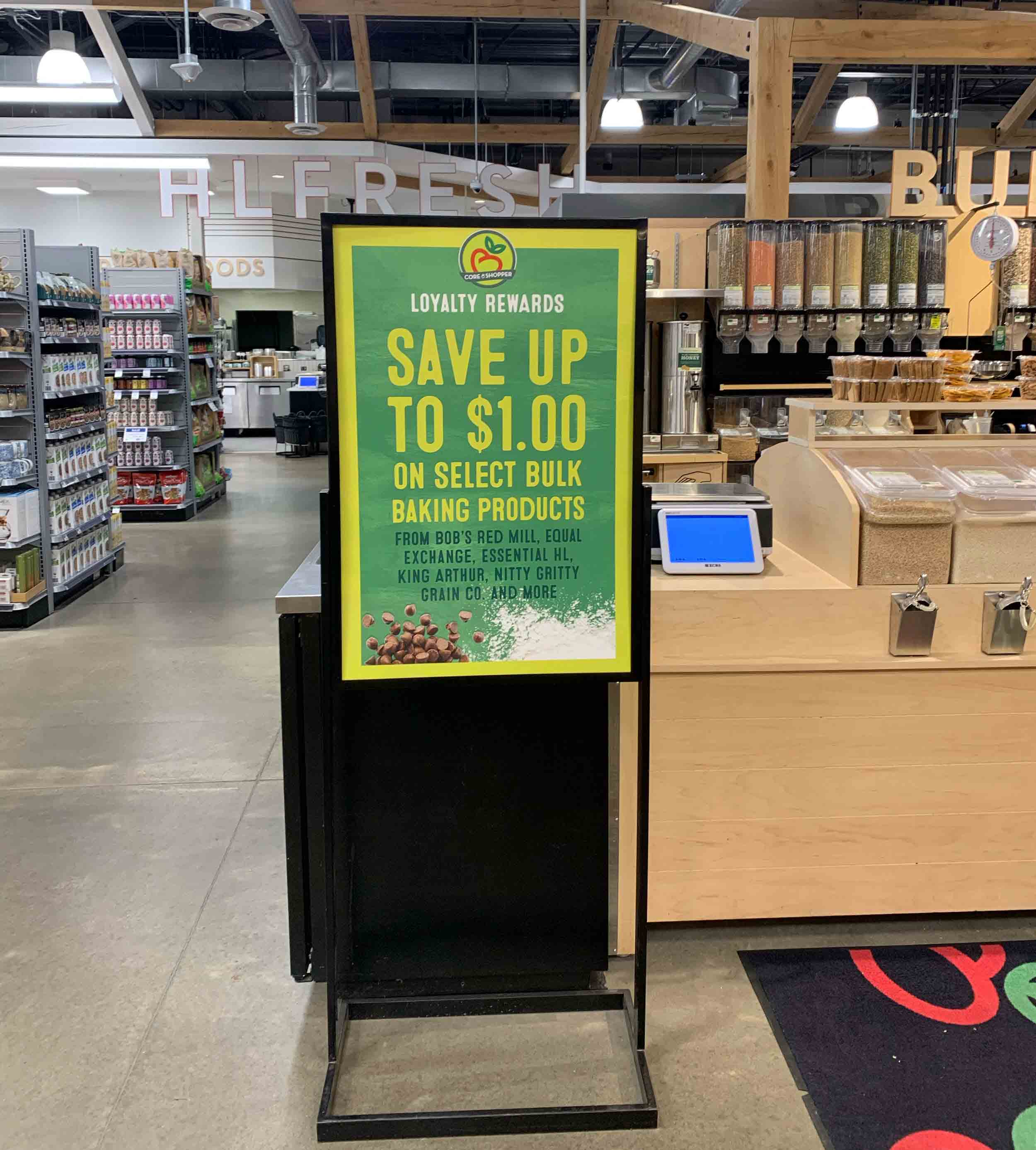 Here are environmental displays with infographic posters and specific deal and product signage at all three Healthy Living stores.